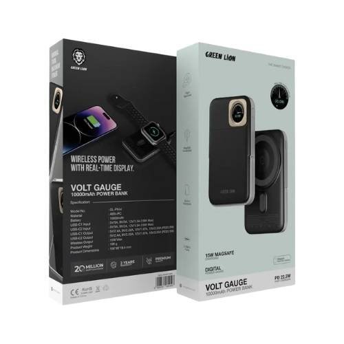 Monitor your power precisely with the Green Lion Volt Gauge 10000mAh MagSafe Power Bank, featuring an advanced real-time power display that shows voltage, current, and battery status for ultimate control. Compatible with MagSafe, it offers seamless 15W magnetic wireless charging – simply snap it onto your iPhone 12-16 series for cable-free power. Combined with 22.5W PD fast wired charging, this is the perfect portable solution for staying charged during travel, work, or daily life in Kampala and across Uganda.