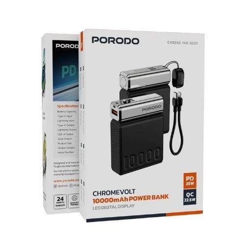 Charge your devices at lightning speed with the Porodo Chrome Volt 10000mAh Power Bank, featuring powerful PD 35W Power Delivery and QC 22.5W Quick Charge for rapid charging. This sleek power bank includes a Type-C to Lightning cable, making it perfect for fast-charging iPhone 16/15/14/13 series or Samsung Galaxy S25/S24 models – ideal for busy lifestyles in Kampala or travel across Uganda.