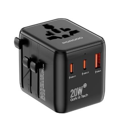 Porodo Universal Travel GaN Quick Charger 20W PD – Fast Charging Wall Adapter with Built-in Safeguards & Compatibility in +200 Countries